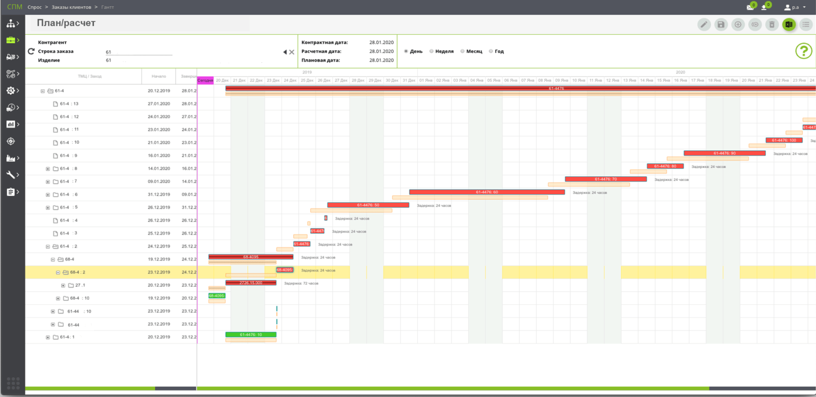 - On-line визуализация: что происходит с заданиями / заказами на уровнях от деталей до узлов, всего заказа в целом. Цветовая индикация отклонений директивного (целевого) плана от текущего расчетного.